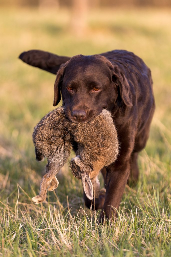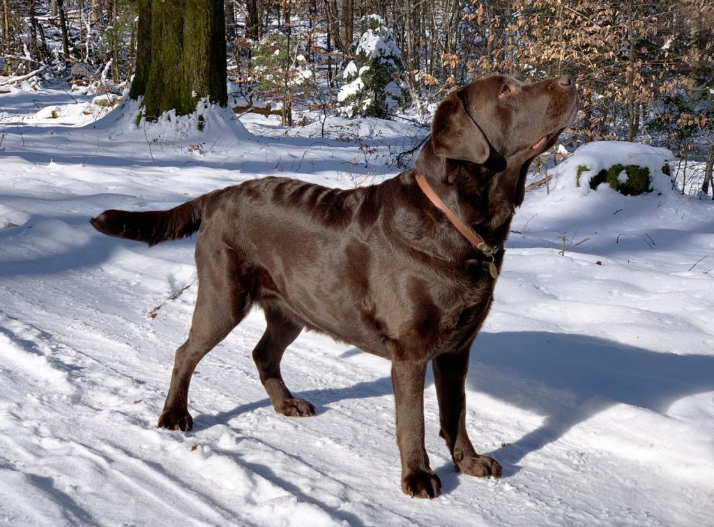 2016 habe ich mir meinen langjährigen Wunsch erfüllt – ein Choco-Labbi. Mit Emily habe ich die jagdliche Arbeit begonnen, wir haben die JP/R und die BLP bestanden. Emily hat hervorragende Gesundheitsergebnisse und einen vorzüglichen Formwert. Leider hat sich mein Wunsch nach einem Welpen von ihr nicht erfüllt, wir haben es zwei Mal versucht. Wir sind froh, das sie nach alldem noch bei uns ist, mit viel Lebensfreude und einem unbändigen Hunger.
